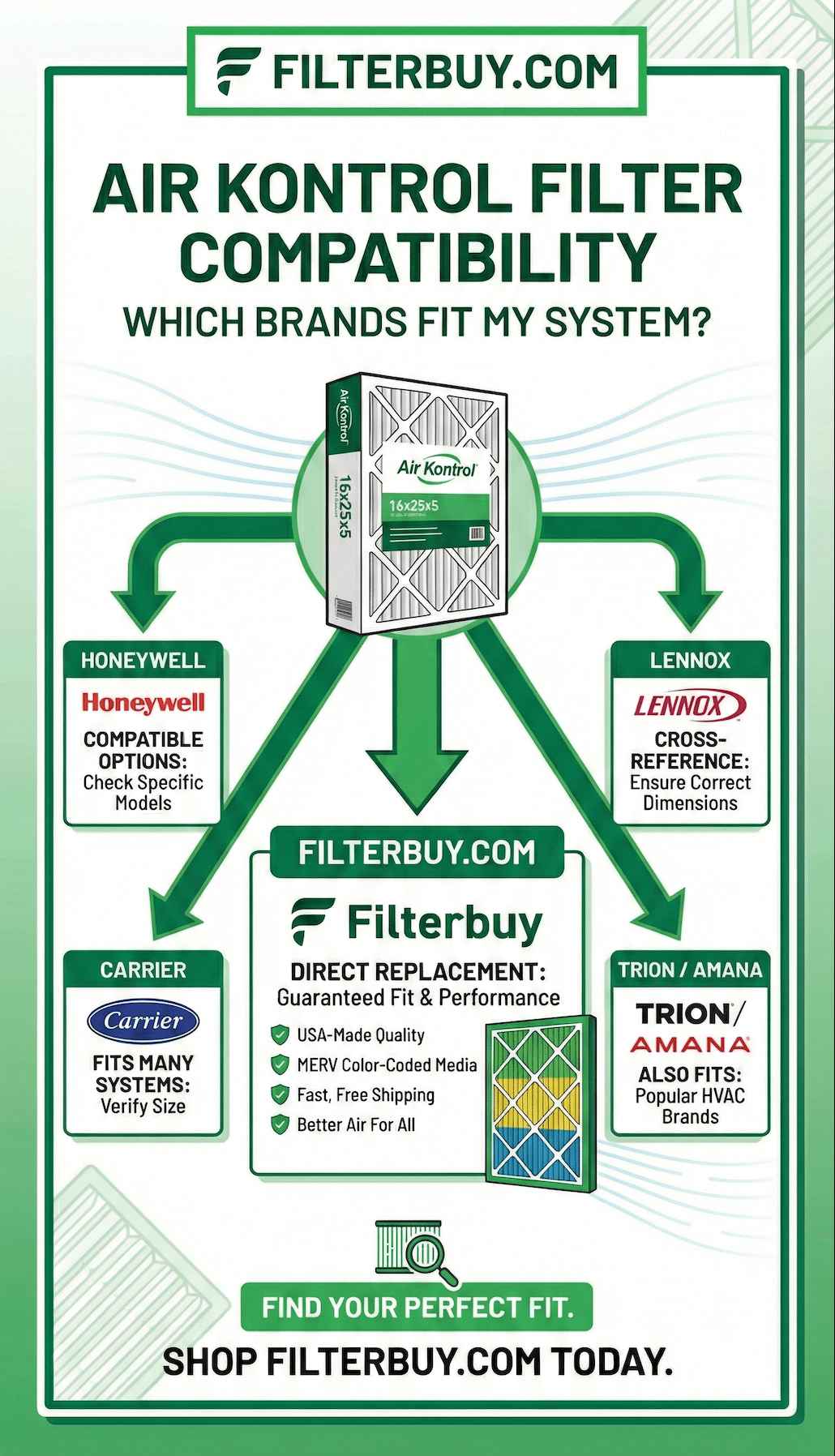 Air Kontrol HVAC systems accept standard-sized pleated replacement filters from multiple manufacturers. Common Air Kontrol filter sizes include 16x25x5 and 20x24.25x5. Compatible replacement brands include Filterbuy, which offers Air Kontrol-compatible filters in MERV 8, 11, and 13 ratings—all made in the USA with free shipping. For best results, match your current filter’s exact dimensions (printed on the filter frame) and select a MERV rating appropriate for your air quality needs. Replace every 90 days for optimal performance.